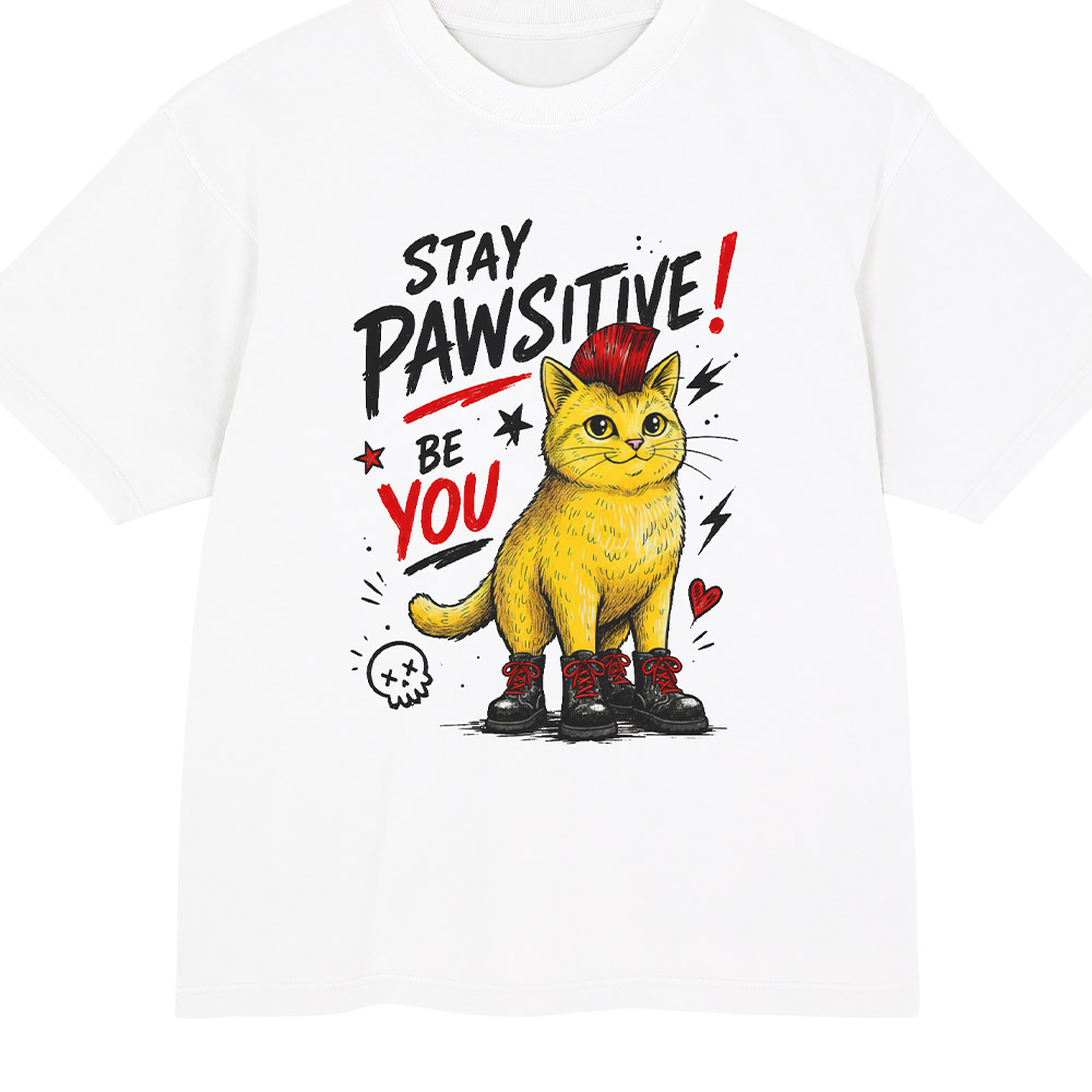 “Stay Pawsitive” temalı bu özel illüstrasyon; asi kırmızı mohawk saçlı, botlu bir kedi karakteriyle pozitif kalmayı farklı bir dille anlatıyor. Minimal ama dikkat çeken tipografi ve kontrast renkler sayesinde hem günlük kullanımda hem de stilini göstermek isteyenler için güçlü bir parça.